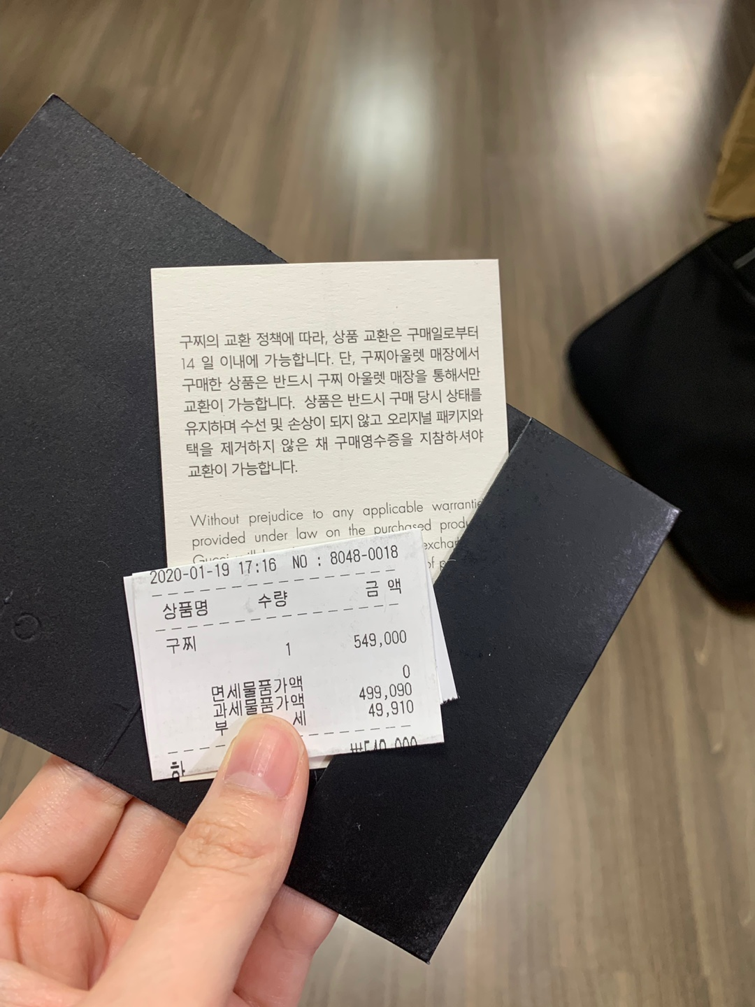 이 제품은 김포 현대 프리미엄 아울렛에서 구매하였고, 가격은 549,000원 이었어요! 제 지갑 사주냐고 팥돌이 허리가 휘어졌겠네욥..보통 백화점에서 구찌 반지갑이 80만 원 정도 하는 것에 비하면 비교적 저렴한 가격이긴 하죠?