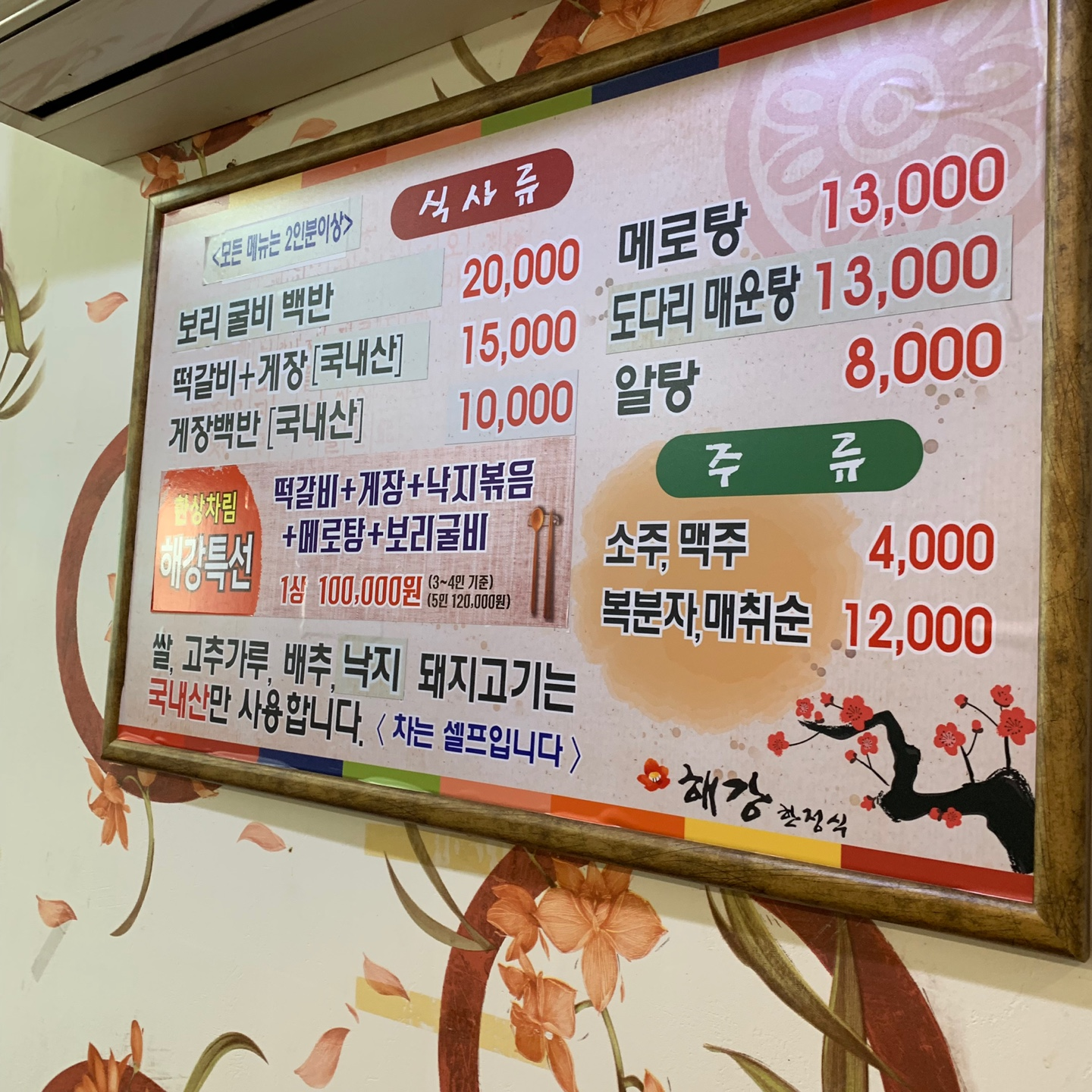 해강의 영업시간은 매일 11:00부터 21시이고 매주 수요일은 휴무라고 합니다.