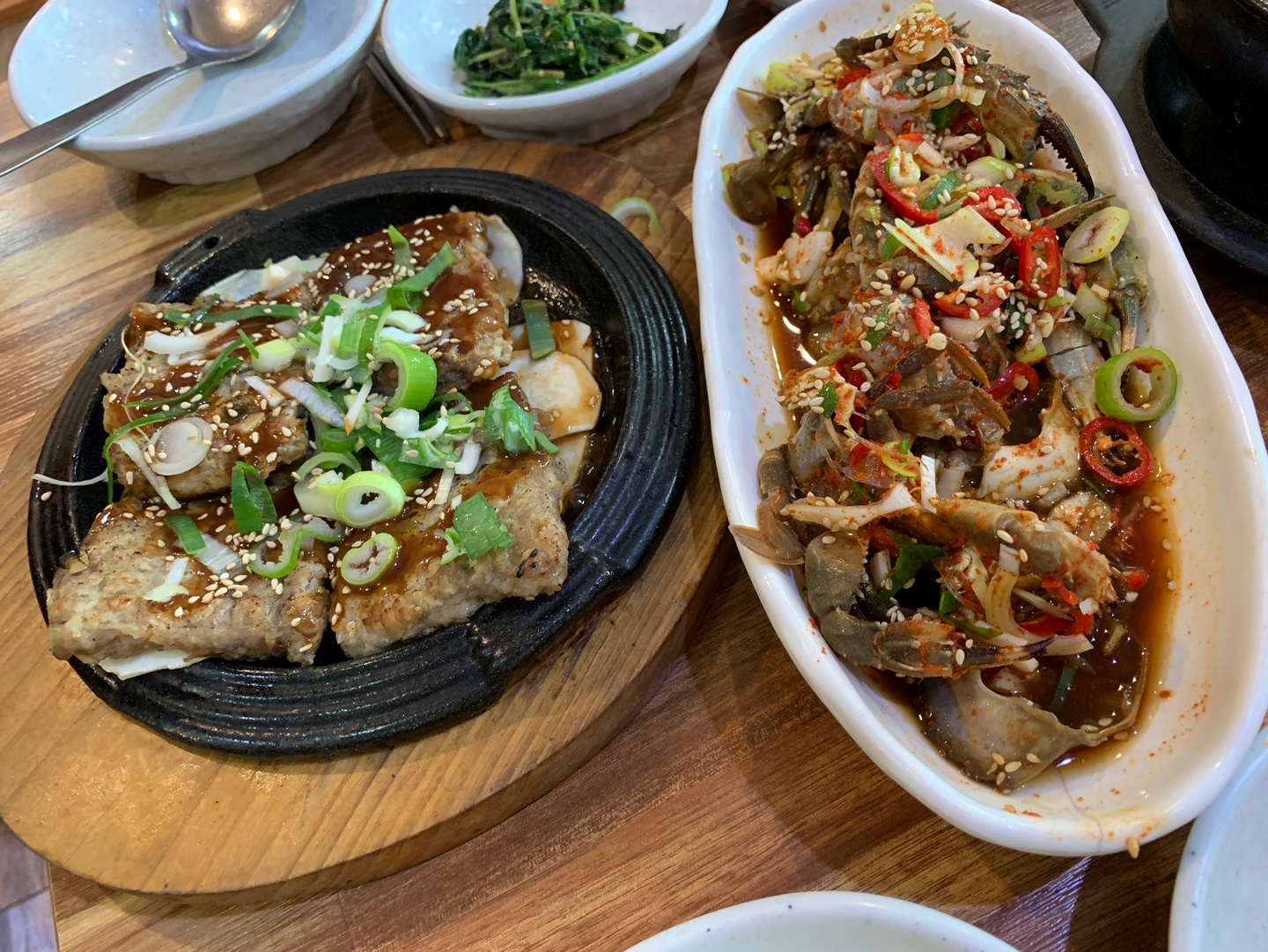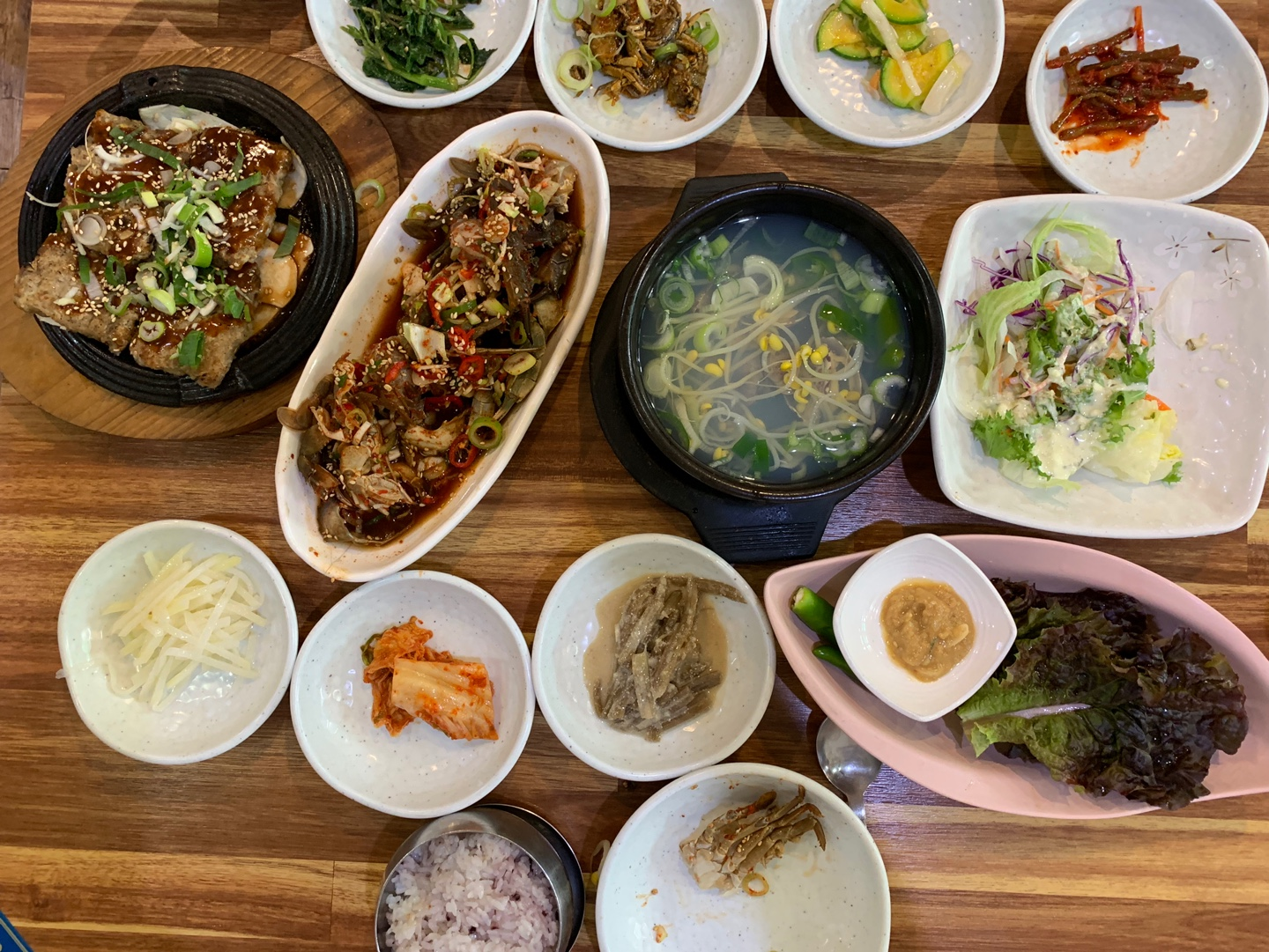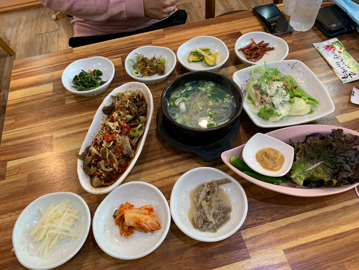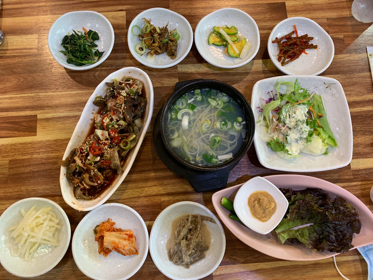 모든 메뉴가 나왔을 때 다시 찍어본 한상차림입니다~ 사진을 먼저 찍었어야 하는데 급한 마음에 게다리 하나 먹은 흔적이 같이 있네요 ㅎㅎ..전반적으로 바지락 국수랑 돌게장 등 메뉴가 다 맛있었고 떡갈비만 조금 아쉬웠던 거 빼면 너무 잘 먹었어요!