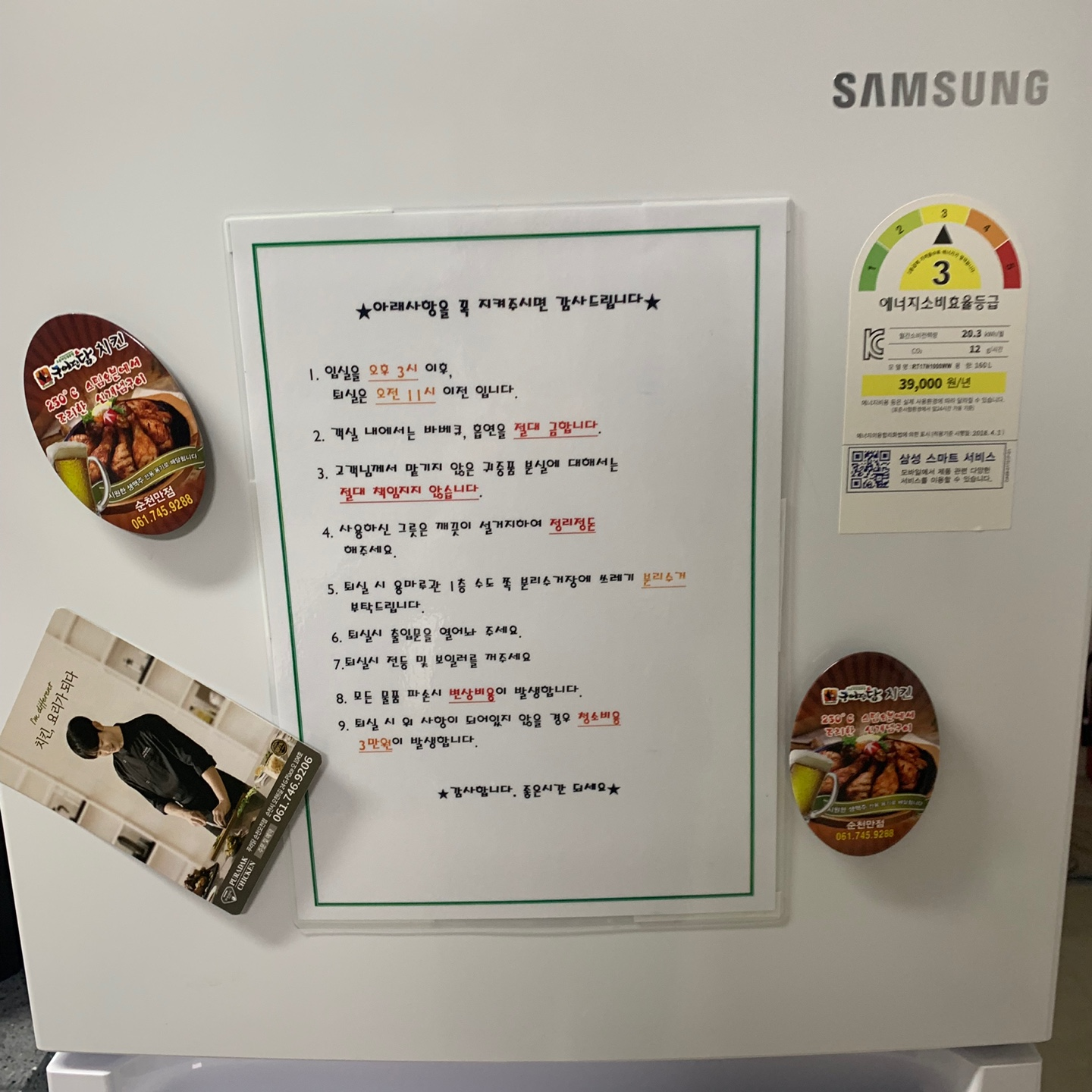 냉장고에 붙어있던 안내문인데 바베큐는 실내에서는 절대 금지이고 공동 바베큐장에서 해먹을 경우에는 2만원을 추가로 지불해야 했어요. 실내는 금연이고 입실은 3시, 퇴실은 오전 11시입니다~