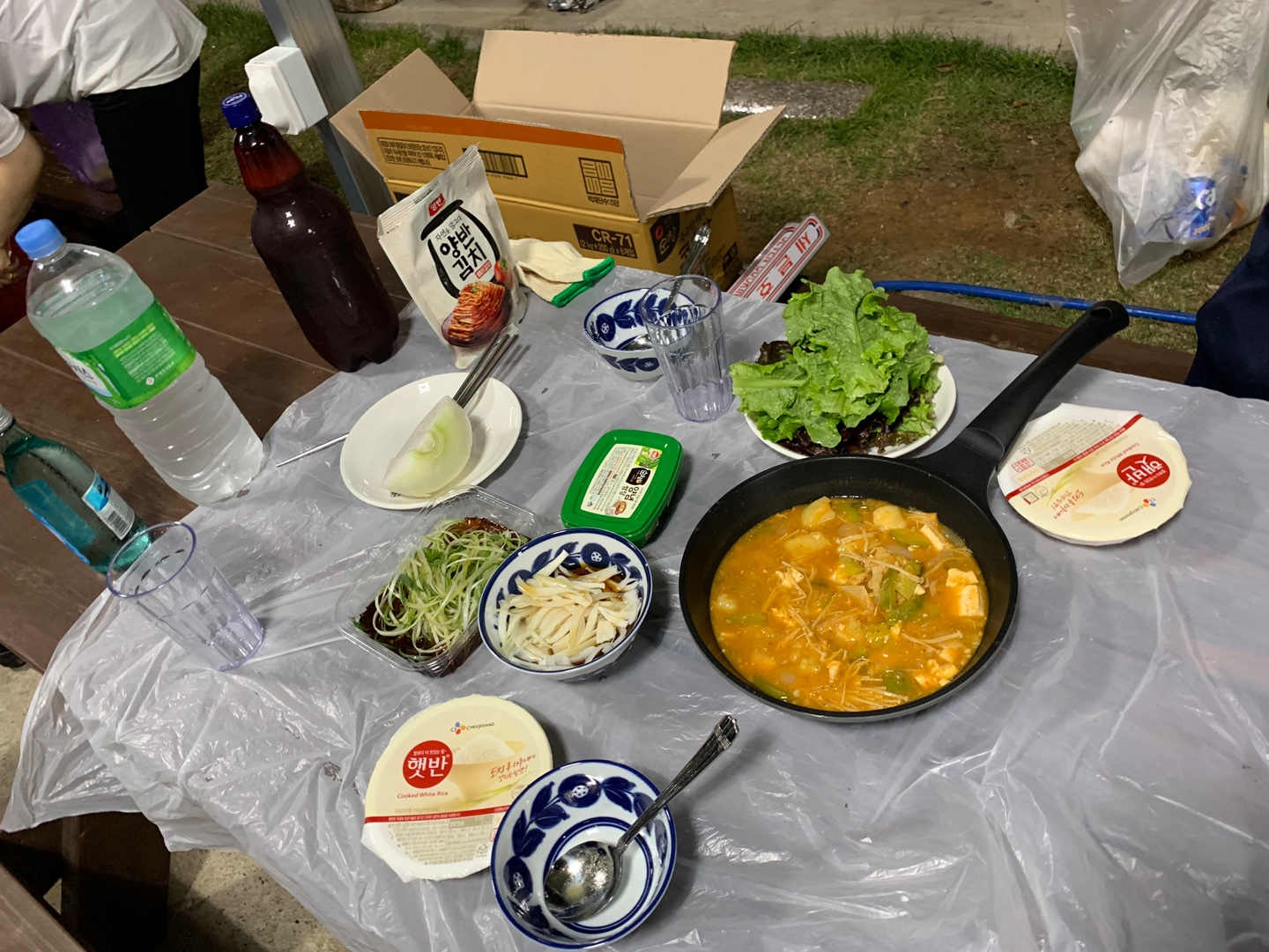 짐을 다 풀고 너무 배고파서 바로 바베큐장으로 향했어요. 사장님한테 말하면 숯불을 가져다주시고 저렇게 테이블에 비닐도 깔아주신답니다. 된장찌개를 만들었는데 조금 신기한 맛이었지만 그래도 먹을만했어요~ 양파도 사서 소스에 절여먹기도 하고 구워 먹기도 했답니다.