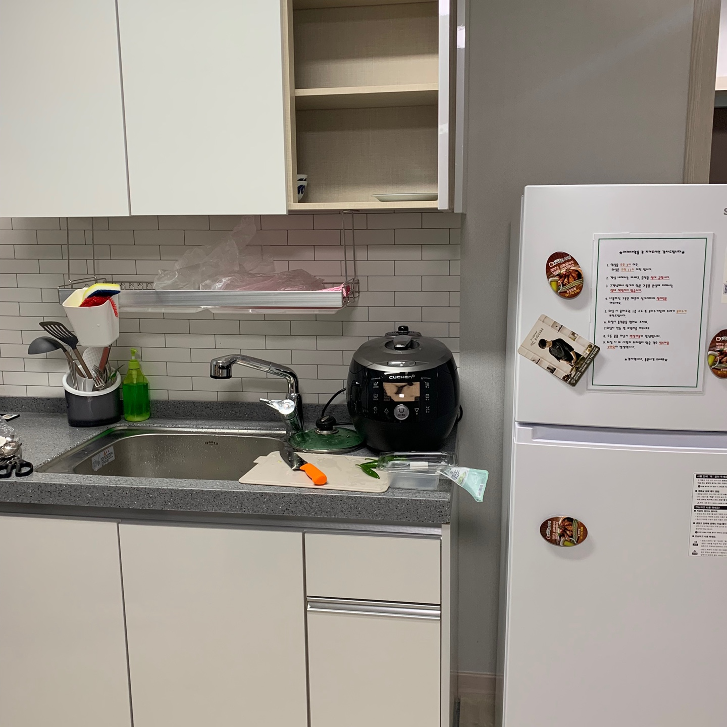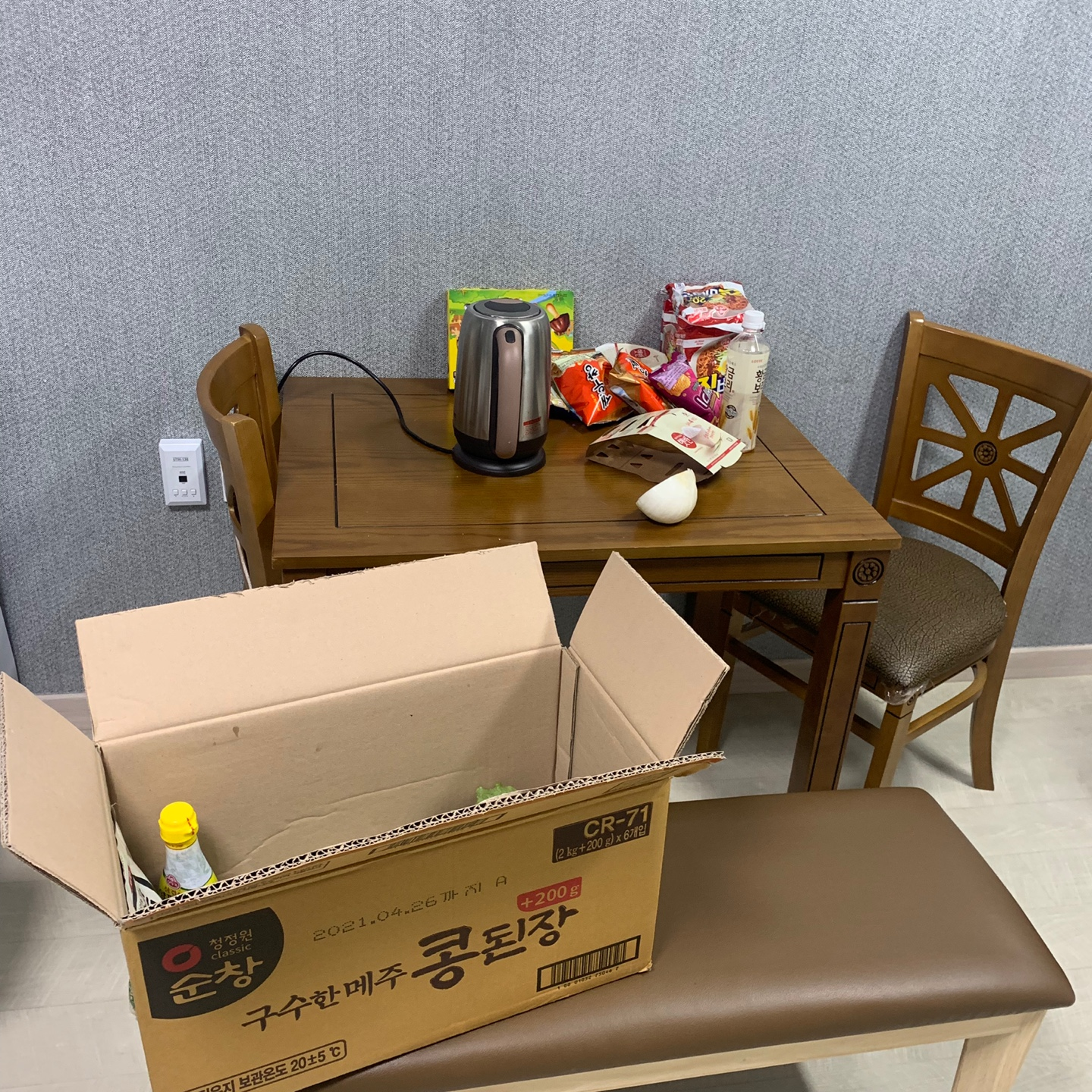 바베큐 거리를 만든다고 장 봐온 것을 여기저기 널어놨더니 조금 어수선해 보이는 주방이지만 인덕션이 있어서 깔끔하고 조그만 식탁도 있었어요. 커피포트로는 햇반을 해 먹었답니다. 근데 주방에 쓰레기통이 하나도 없더라고요..? 쓰레기를 어디다가 버려야 할지 조금 난감해서 저희가 장 봐온 박스에다가 넣었어요.