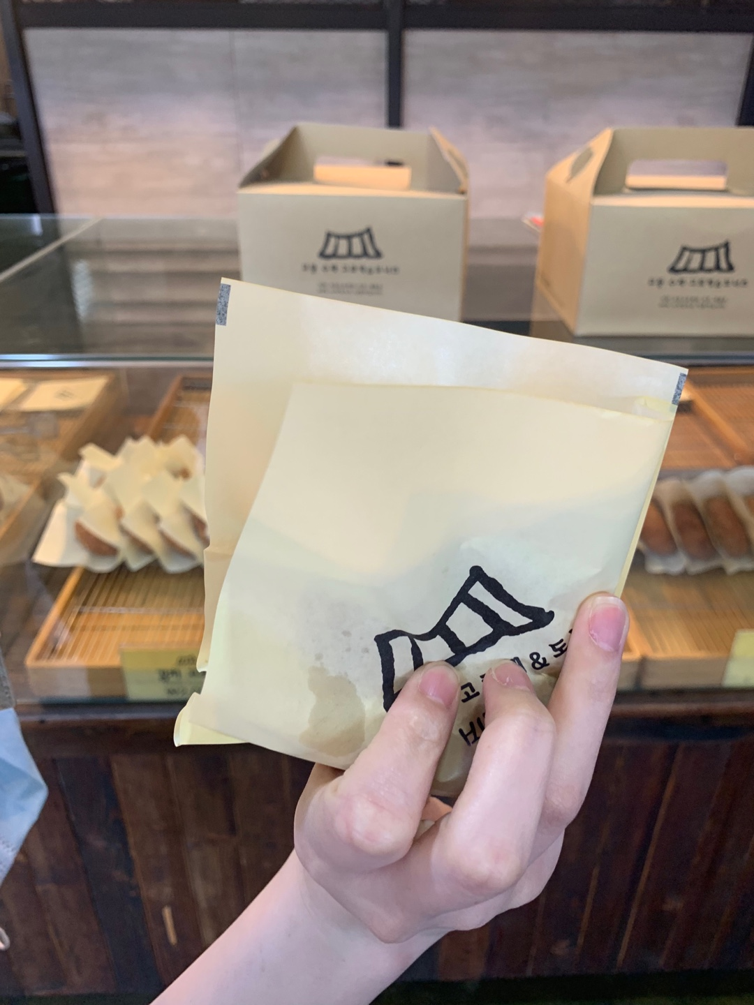 바로 먹고 간다고 하면 이렇게 기와집이 그려져 있는 종이에다가 고로케를 싸서 주시더라구요.