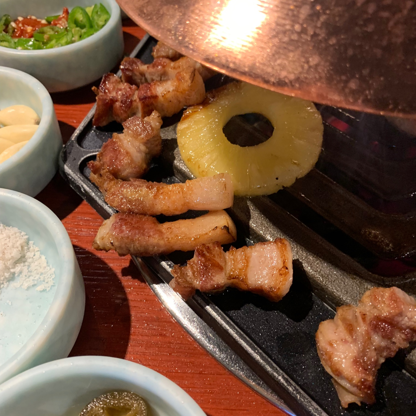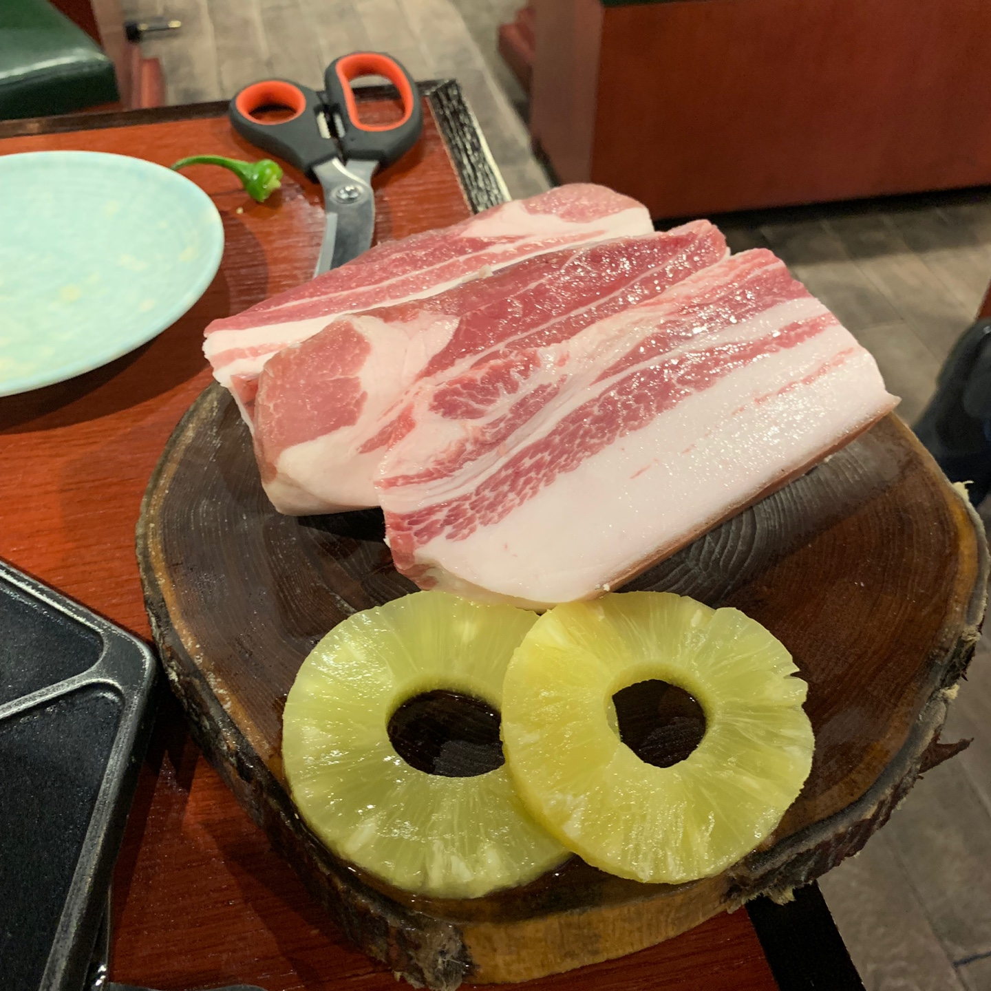 저희는 이날 목살을 주문했는데 요 아름다운 빛깔의 자태가 보이시나요”? 파인애플은 서비스로 같이 주는 것이랍니다.