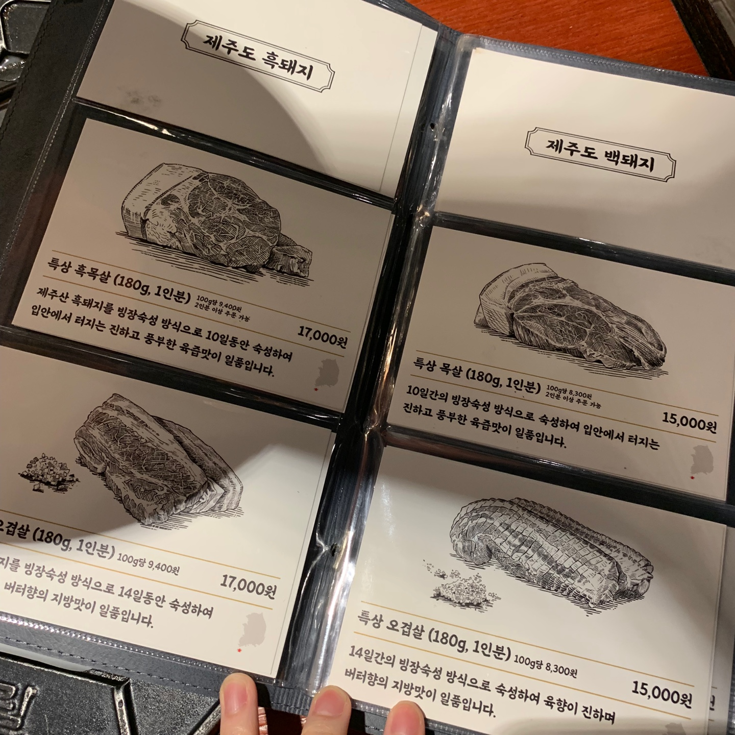 고기 종류는 가브리살, 갈매기살, 흑목살, 오겹살, 일반 목살 오겹살 등이 있는데 저희 가족은 그때그때 먹고 싶은 메뉴를 시켜먹고 주로 흑오겹살이나 흑목살을 많이 먹어요. 항정살도 진짜 맛있는데 ㅠㅠㅠ이날은 항정살이 품절이라고 했어요. 가격도 1인분에 15,000원으로 합리적인 편입니다.