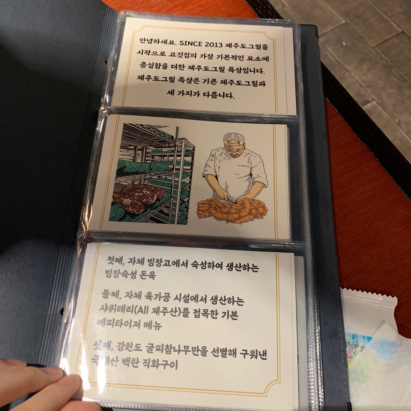 제주도그릴 메뉴 제일 첫 장에는 이렇게 가게 소개가 있네요, 2013년에 오픈했다니 벌써 10년이 다되어가는 맛집 ㅠ 직접 숙성하고 맛있는 애피타이저와 직화구이 요 세 개가 제주도그릴의 특징이라고 해요. 사장님의 엄청난 연구가 들어간 게 느껴지시나요..?